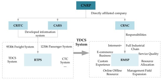The existing information system of China’s railway was mainly developed by the China Railway Information Technology Centre (CRITC), the China Railway Academy of Sciences Group Company (CRAS), and the China Railway Network Company (CRNC), all of which belong to the China National Railway Group (CNRP). The Railway Transportation Production System (RTPS) and Railway Management Service Platform (RMSP) of the CNRP are shown in Figure 4. The RTPS was developed jointly by the CRITC and CRAS and supports the current transportation and production work of the railway. The RTPS includes Train Operation Dispatching Command System (TDCS), Centralized Traffic Control System (CTC) and many other systems. The CRNC is wholly owned by the CNRP as of November 2015. The development and operation of data and network resources is the main body of the legal corporation with independent operation, independent accounting, and self-negative profit and loss. The company is committed to the Internet Plus action plan based on the industrial chain of the railway, optimizing resource allocation; building a full operation service platform that serves the passenger cargo owner, railway passenger and cargo transportation, the head office, and affiliated enterprises; expanding e-commerce business and business areas; improving user experiences and service quality; and promoting the transformation and efficiency of railway enterprises. Some companies in China’s railway network can make use of the railway production information system data owned by the CRITC and CRAS to better build the railway ecological chain and the Internet Plus business.