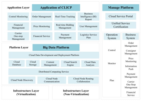 The logical architecture design of CLICP is shown in Figure 5. It is divided into infrastructure, platform, and application layers, with a cloud management platform layer in which the operation support system and business support system are integrated to form the background management of the CLICP. The infrastructure layer realizes the distributed deployment and allocation of resources through virtualization technology. The platform layer builds a big data service platform based on distributed computing and distributed storage to realize the functions of cloud data storage, business management, search, communication, and computing. The application layer mainly develops the CLICP’s application function modules, including the central monitoring, order management, real-time tracking, Business Intelligent (BI) report, financial management, price monitoring, real-time bidding, user management, carrier one-stop management, financial service management, online payment, and logistics solution management modules.