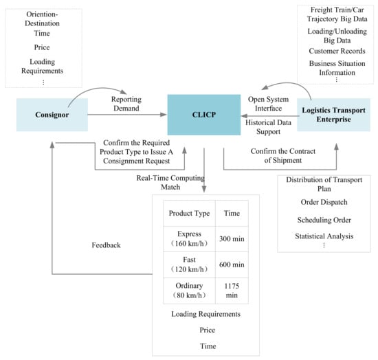 As shown in Figure 7, the CLICP acquires historical transportation production data through the opening of the ports of its own production information system by railway and highway transportation enterprises as data support for sending transportation schemes, dispatching instructions, order distribution, and statistical analysis. According to actual transportation demand, the consignor can obtain a door-to-door logistics freight product and its corresponding attribute information from the CLICP, including price and time, and then choose the optimal freight product within the acceptable price or transportation time range. The cloud-based cross-border logistics transport scheme has the advantages of accurate marketing, efficient feedback, and mutual benefit.