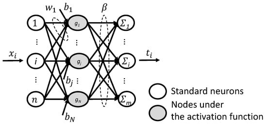 where H is the hidden layer output matrix, denotes the output weights matrix between the hidden layer and output layer, T represents the target output results of the output layer, refers to a non-linear piecewise continuous function, such as the sigmoid function, is the input weight vector between the input node and jth hidden node, refers to the ith input data where n means the dimension of the input layer, represents the bias of the jth hidden node, denotes the output weight vector between the jth hidden neuron and output nodes, and is the m-dimensional target vector originated by . Furthermore, and result from any continuous probability distribution, such as the rectangular distribution; the human intervention consequently decreases. To conclude, the term comes to be the inner product of and . For clarification purposes, the structure of the traditional ELM is shown in Figure 2 where all layers are identified in detail.