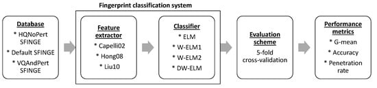To summarize, all materials and methods (Section 3 along with Section 4) are depicted in Figure 5 where the fingerprint classification system (the combination of a feature extractor and ELM) is proposed for the first time.
