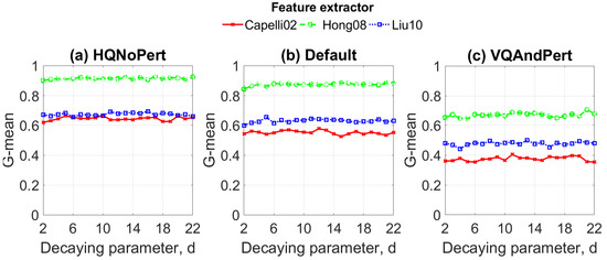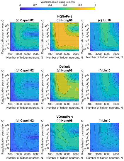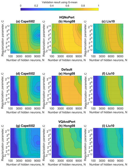 In order to maximize the G-means metric, the hyper-parameters of ELMs to be estimated are the regularization parameter (C) and the number of neurons in the hidden layer (N) in the validation set. Remember that the G-means makes sense in unbalanced datasets because it allows the normalization of the accuracies of each class. As mentioned in the Section 4.2, the dataset was divided into three subsets: training, validation, and testing. Figure 6, Figure 7 and Figure 8 show the validation results using G-mean in terms of these hyper-parameters for the standard ELM, W-ELM1, and W-ELM2, respectively. Aiming to establish overall observations, the regularization parameter varied from to (very-small and very-large positive numbers based on its definition, see Equation (2)), and the number of hidden nodes gradually increased. All studied feature extractors (Capelli02, Hong08, and Liu10) and datasets (HQNoPert, Default, and VQAndPert) were taking into account.