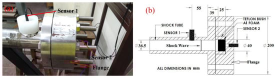 The end-wall of the shock tube was made of stainless steel having a centreline axial cavity of 9 mm dia running through the entire thickness of the flange. Sensor-2 (102B) was inserted through the axial cavity from behind the end-wall, resting about 2 mm away from the back surface of the foam. The hole allows the sensor to be recess-mounted such that it is not damaged during foam deformation on shock loading. Further, it is known that, if the end-wall has a hole of size smaller than a third of the shock tube diameter, the shock reflection at the end-wall is unaffected [