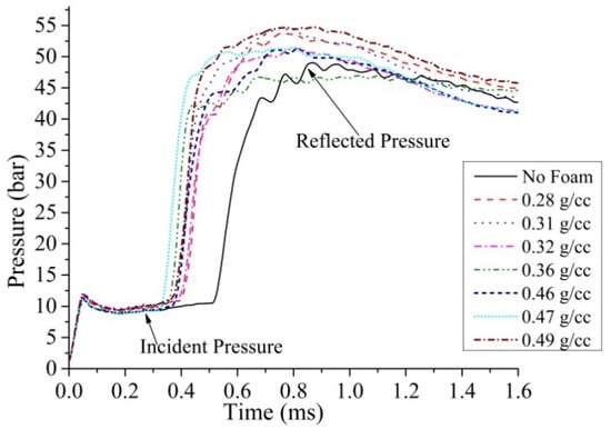 The effect of foam density on the total compression can be explained by comparing the plastic strength of the foams with the incident and the reflected pressures. The plastic strength of foams under quasi-static compression is known to vary from about 2 MPa (20 bar) for 0.28 g/cc density to 5 MPa (50 bar) for 0.49 g/cc density [