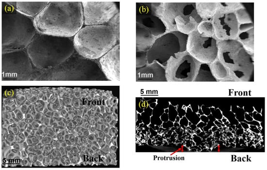 Figure 5d) can be seen to continue to the subsurface region, which remains uncollapsed. The 3D CT images confirm that densification occurs towards the far end of the foam because the exit face is fully supported by the rigid end-wall (but for the cavity part). Unlike the observation of reference [