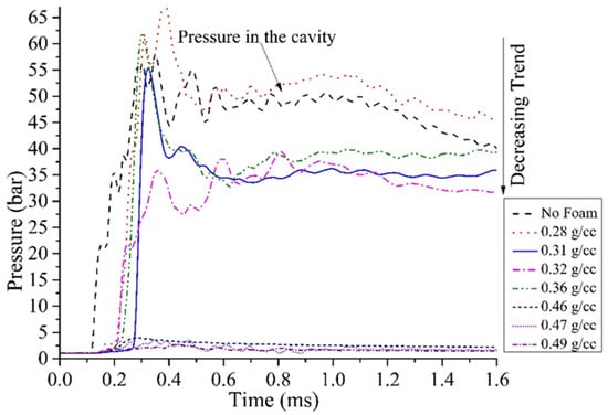 Figure 6 presents the variation of pressure in the air cavity in the end-wall of the shock tube, as measured by sensor-2, without and with the foams of various densities, fully supported against the end-wall. For the “no foam” condition (baseline value) as well as in the presence of foams of densities less than 0.46 g/cc, there is significant rise in pressure. In addition, the pressure rises sharply to a peak value indicating compaction wave transmission, drops to an intermediate value and then remains steady till the end of the measurement (1.6 ms).