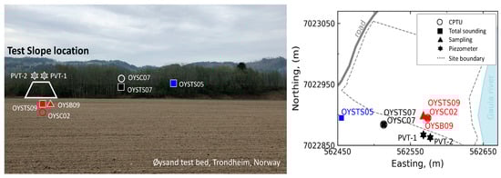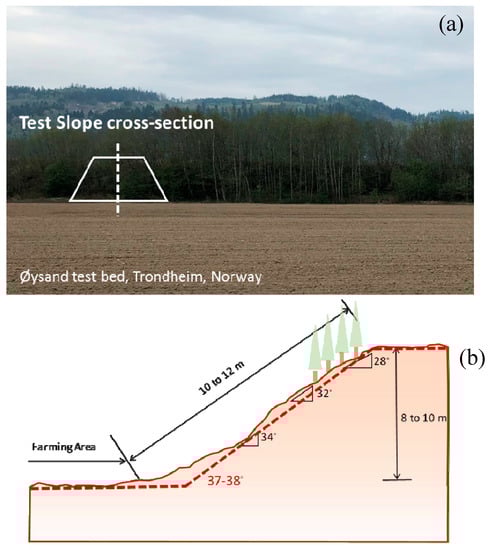 Several possible sites were screened for this study; those sites form part of the Norwegian Geotechnical Test Sites project [], which characterize five different sites with soil compositions ranging from gravel to clay. The most suitable site was the Øysand site, because of its soil composition and the presence of a natural slope.