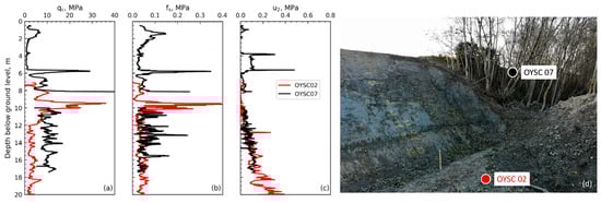 Figure 3 shows the CPTu results in terms of cone resistance (qc), sleeve friction (fs), and pore water pressure (u2). The zero depth is fixed at the top of the slope, hence the depth of OYSC02 (performed at the bottom of the slope) was corrected by adding 6.1 m to the measured depth in the field. A surficial silty sandy layer is identified in the very first meter of the slope, while clayey, silty soil was found from 2 m to about 5.5 m depth, the clay content seemed to increase with depth because the pore water pressure u2 increased between 3.5 and 5.5 m. Below 5.5 m and down to about 10 m depth interlayered gravelly sand and gravels were found, below that depth and down to 20 m sandy silty and gravelly sands were found.