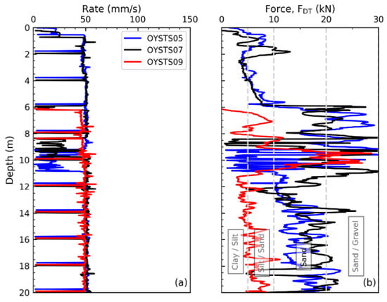 Total sounding tests were also used to determine the soil stratification in addition to the CPTs. Results of OYSTS05, OYSTS07 performed at the slope top are compared against the results of OYSTS09 located at the bottom of the slope. A correction of the depth was also applied to OYSTS09. Similar deductions, as for the ones reached from CPTu, were obtained from the TS. Silty clayey material over sand and gravels were found across the slope. Note that hammering and flushing were required to advance through sections of the gravel layers, the applied forces exceeded 20 kN in the deeper gravel layers. The TS results, (a) rotary speed rate (b) rotary force shown in Figure 4, provides a good indication of the soil variability with depth. A comprehensive geotechnical soil investigation of the Øysand site is given in Quinteros et al. [].