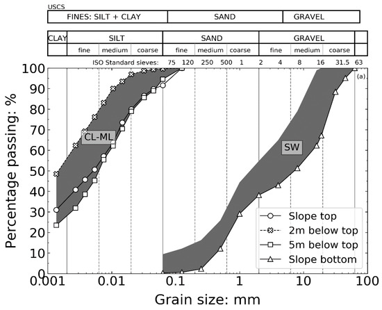 Representative grain size distribution (GSD) curves obtained from samples at the slope surface are presented in Figure 5. Samples were collected at the top of the slope, at about 2 m below the top of the slope, at around 5 m downwards, and at the bottom of the slope. GSDs are useful for preliminary assessment of the frost-heave susceptibility of the soils at Øysand. Soils found on the slope were classified as CL-ML (top to 5 m below) and as SW at the bottom of the slope by American Society for Testing and Materials (ASTM) []. Those soils are deemed as frost-susceptible after the Norwegian frost classification system NS200 (Statens Vegvesens, Norway) [], which is based on GSD comparison. Frost heave tests were performed on the main soils (ML and SW) to confirm the frost susceptibility of the soils found at the slope surface, results are subsequently presented.