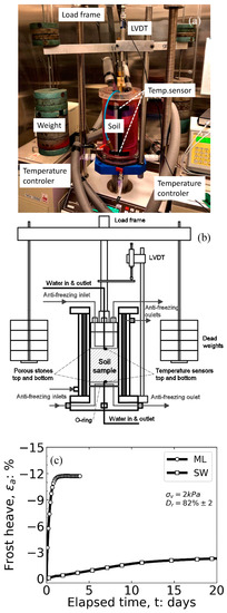 (a) Soil heave test apparatus with temperature controller (NGI and KICT); (b) Sketch of temperature-controllable cell (modified from Jin et al.) []; (c) Frost heave results on ML and SW soils.
