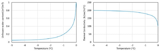 The full thermal model (TEMP/W) was applied to simulate freezing–thawing of soils. The water content in the model was changed during the analysis. The main parameters for the thermal model were thermal conductivity vs. temperature and unfrozen water content vs. temperature (see Figure 8). The saturated/unsaturated model (SEEP/W) was applied to simulate water flow into the soils. The model allows seepage analysis in fully saturated and unsaturated soils. The main parameters of the model are water conductivity vs. matrix suction and water content vs. matrix suction (see Figure 9). Those parameters were verified and revised based on the continuous field monitoring and the data from instruments on the slope, as discussed below.