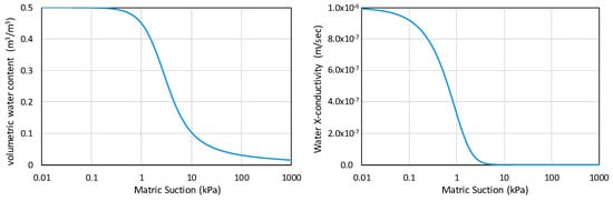 Water conductivity vs. matrix suction and water content vs. matrix suction.