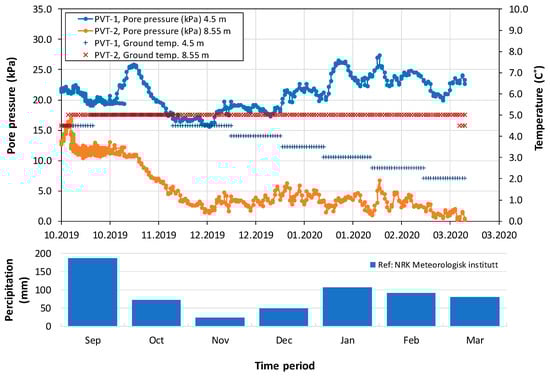 Measured pore water pressure and ground temperature from PVTs are presented in Figure 12. PVT-1 and PVT-2 were embedded at 4.5 m (Unit I, silty clay) and 8.55 m (Unit II, sand) depth, respectively. Measured pore water pressure at PVT-1 was average 21 kPa, indicating the groundwater level was about 2 m from the slope surface, which was supported by CPT results in Section 2.1. Measured pore water pressure at PVT-1 increased from 15 kPa to 27 kPa proportionally to the decrease of ground temperature from 4.2 °C to 2 °C from November to January. It is estimated that the frozen ground absorbs unfrozen water developing a gradient of water in the same direction as the temperature gradient, which can increase the level of the groundwater table. Another reason for the pore pressure increase is the increase of precipitation in this period, according to the recording data from the weather station (NRK Meteorologisk institutt, Øysand, Norway) []. Pore water pressure at PVT-2 measured around 15 kPa in early October converged to less than 5 kPa because the pore pressure was dissipated after heavy rain in September at a depth of Unit II, consisting of gravelly sand. Measured temperature from PVT-1 decreased and converged to 2 °C at 4.5 m depth while the temperature from PVT-2 remained constant of 5 °C at a depth of 8.55 m.