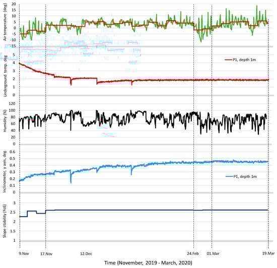 Another measured data set from the integrated sensor pack I-1, shows the slope inclination, ground temperature, together with air temperature and humidity obtained from November 2019 to March 2020 in Figure 13. Air temperature fluctuated between −12 to +18 °C. Those values were slightly higher than the average temperature in 2017 and 2018 used in the parametric study (see Figure 10). Meanwhile, ground temperature was almost constant, ranging from 1.8 to 2 °C at 1.0 m below the surface from the ground. Air humidity varied between 30 to 100%. The values of slope inclination were recorded every hour. The inclination of the slope increased slightly from 0.2° to 0.45°, which meant 2 mm displacement in a downward direction. Even though this change of inclination is negligible, it is important to keep monitoring the inclination of the slope depending on the changes of ground temperature. A threshold inclination was set to increase the interval of logging of inclinometer data from 1 h to every 10 min.