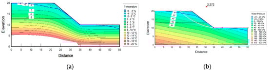 The full thermal model (TEMP/W) was applied to simulate ground temperature distribution along with the depth, and the saturated/unsaturated model (SEEP/W) was applied to simulate water flow into the soils, as shown in Figure 14. The average air temperature for 3 days was applied to the surface of the ground because the ground temperature was not changed immediately as the air temperature changes. The boundary at the slope surface was modeled with temperature, which is supposed to be transmitted to the ground corresponding to the measured temperature. Coupled seepage analysis was carried out to model groundwater table and pore water pressure, which are matching to the measured pore pressure. The input parameters used for the slope stability analyses have been verified by measured data. Those parameters will be revised by the continuous field monitoring and the data from instruments for the whole year.