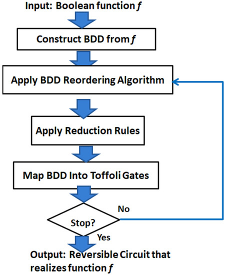 The BDD-based algorithm of reversible circuit synthesis implemented in [27] is shown in Figure 4. First of all, the BDD of the input Boolean function is constructed; thereafter, an iterative BDD reordering algorithm followed by the application of BDD reduction rules is applied. Once a small-sized BDD is generated, it undergoes the mapping phase (which is the core of our work), where each node is substituted by a cascade of Toffoli gates following a pre-constructed look-up table. Finally, the synthesized reversible circuit that realizes the input Boolean function is outputted from this algorithm.