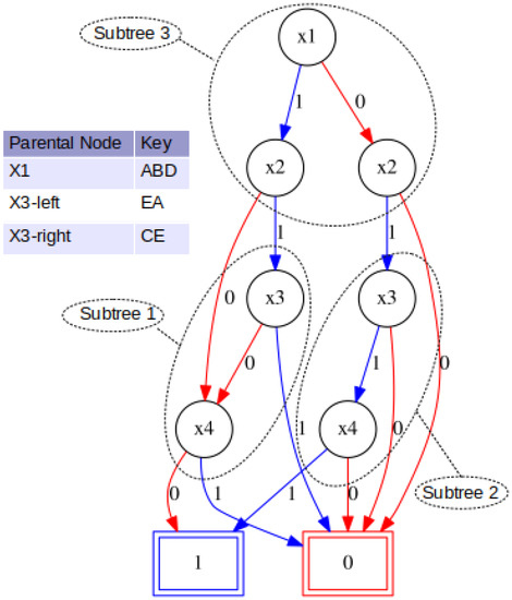 BDD representation of the Boolean function , where three subtrees are investigated and the construction of their suitable hash keys was performed as long as their parental nodes were identified.
