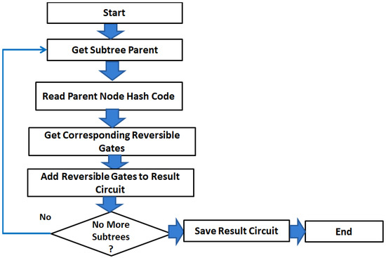 Our contributions can be summarized as follows: (1) Pre-prepared and well-studied combinations of all possible subtrees were created to form a look-up table that maps each possible subtree with its corresponding reversible gates. (2) Suitable hash keys were developed for all investigated possible subtrees in order to make the retrieval time of the corresponding reversible gates constant during the traversal time of a given BDD. (3) We traverse a given BDD (with an inherent Depth-First Search) and convert all its composing subtrees to their suitable reversible gates, forming a complete reversible circuit. (4) A subtree identification algorithm is developed to be used during the traversal time of the BDD subtree. This algorithm investigates a given subtree and constructs a suitable hashing key to be used to directly retrieve the subtree’s corresponding reversible gates from the look-up table. (5) More details were added in this work to extensively illustrate the idea presented in the previous work. These details were supported by suitable mathematical formulas and flowcharts. (6) In a previous work, we proposed the idea of minimizing synthesis time, but we did not mention where our work should be considered in the process of converting a Boolean function to a complete working reversible circuit. Here, we illustrated where our work is situated in terms of the steps of the conversion process. (7) A complete code is developed in order to test the work and measure the difference between nodal and subtree-based mapping. (8) Experimental tests were conducted to measure the accurate time of mapping in both nodal and subtree-based cases.