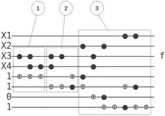 For example, Figure 6 represents the BDD for the Boolean function , where the dashed, numbered subtrees represent the sequence of their determination in order to convert them into suitable cascade reversible gates. Figure 8 represents the generated reversible circuit of the BDD, where the numbers 1, 2 and 3 associated with a set of reversible gates correspond to the same numbers representing the subtrees in Figure 6.