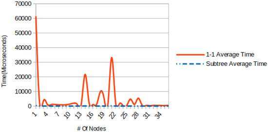 In order to measure the amount of time reduction by moving from one-to-one to subtree mappings, we conducted an experimental test and recorded the time expended in both approaches. In our test, we used the circuit files that come with the Revkit package (40 files) as testing data. These files contain data regarding the set of BDDs generated by the Revkit. The files contain enough information with respect to the nodes and links of sample BDDs to construct the entire BDD in computer memory. Our algorithm takes these files as an input, works on them to construct the BDD for each file, then converts these BDDs to their corresponding reversible circuits once by considering the one-to-one approach and by considering the subtree. In each approach, the running time (in microseconds) is recorded for the comparison process. The result of the run is a table containing the file name and the running times of both approaches. In order to get rid of the machine dependency and to be sure that results are accurate, we repeated the process for all files 100 times and computed the average time for each file and for each approach.