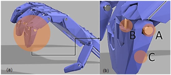 Configuration of materials and components: (a) full hand view; (b) finger detail, where: Point A—nickel plated steel mounting bolt, Point B—high strength line, Point C—PETG (Polyethylene Glycol Terephthalate) prosthesis body.