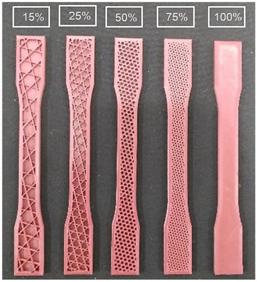 For the manufacture of PB and execution of the tensile test of this work, it was considered as a controlled parameter the density of infill in Tri-Hexagonal format, obtained by Cura Ultimaker software version 3.6.0. Since, this type of infill is considered as one of the fill patterns that gives greater mechanical resistance to the FDM technology printed part [15,19,26,27,28]. Figure 3 shows a photo of the internal fill pattern for 15%, 25%, 50%, 75%, and 100% infill, respectively. As seen, the inner geometry is geometrically as defined by the software.