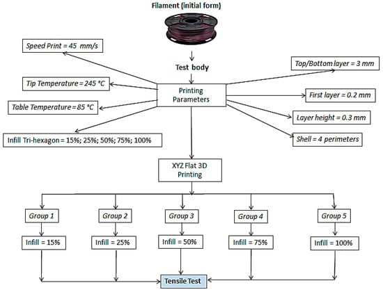 From the use of the initial form of the PETG Filament and after defining the printing parameters, a total of 25 PB were subdivided into five groups, with quintuples with 15%, 25%, 50%, 75%, and 100% infill.