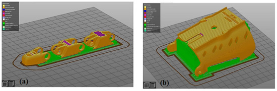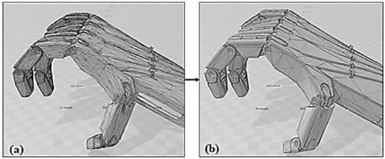 The prosthetic device developed and constructed presents an anthropomorphic appearance, employing the tenodesis effect to create the movement made through the wrist flexion movement and passive digital release via elastic components. The fingers and thumb are attached to a palm component by mounting screws and the palm region hinges with a stabilizing “glove” forearm support. Active flexion movement of the wrist is achieved through a line of high non-elastic resistance, and passive extension of the fingers occurs through elastic elements such as orthodontic elastics along the back of the fingers. It was FDM type with PETG polymeric material. With the projected 3D CAD project and the printing parameters set a priori in the project, it was possible to print the device with 25% infill. Figure 18 illustrates the process of printing some of the device’s main components through the image generated by the printing software.
