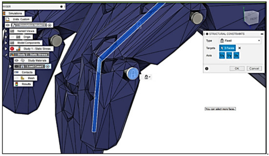 Step 3: For closer proximity to the practical reality of using the prosthesis, the fixation constants were allocated at the nylon line joints between the phalanges and over the nickel-plated steel pivot pins, as shown in Figure 11 below.