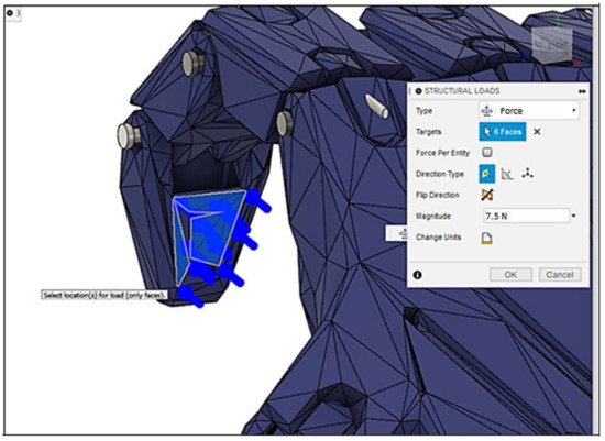 The acting forces on the object were allocated at the ends of the 7.5 Newton modulus phalanges, following orientation [19,20,25] as shown in Figure 12.