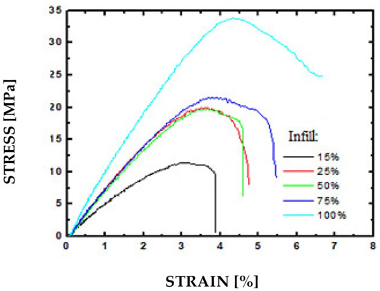 Of the five tests performed for each group of 15%, 25%, 50%, 75%, and 100% infill samples, Figure 13 shows the results of the samples whose maximum stress values obtained in the assays were closer to the mean of the corresponding group. Table 2 presents the synthesized results of the mechanical properties obtained through the tensile tests performed.