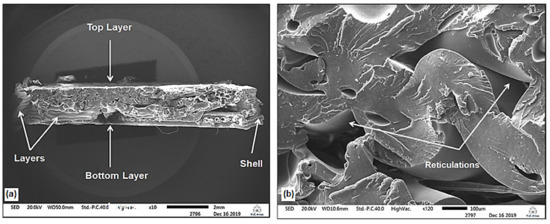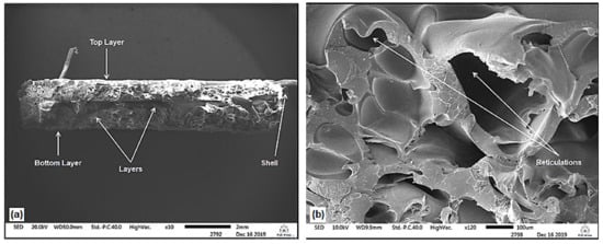 Microstructure images for 100% sample infill: (a) the deposition lines of the layers, shell, and top/bottom layer and (b) the internal reticulations.