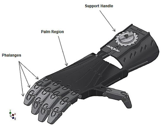 Regarding the finite element simulation, gauging the mechanical functionality of the device through static load simulations, using the gripping force of 7.5 N in the distal region of the phalanges, the proposed load responses present a maximum stress of 13.45 MPa on the plotted line. In the palmar and phalangeal region, a maximum value of 11.17 mm was found for the relative displacement of the surface in the proximal region of the middle finger phalanges. According to the simulation the surface of the device showed no plastic deformations and/or ruptures. Additionally, according to finite element studies, nylon thread was used for stress support simulation up to 31.19 N until its rupture.