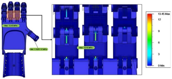 For the development of the simulation finite element model to evaluate the stress concentration on the surface [31,37,38,39,40], forces of 7.5 N were used in the distal region of the phalanges individually, according to the bibliographic orientation [19,20,23,25,35,36]. Responses to the proposed loads showed maximum stress of 13.45 MPa on the braided line near the proximal phalanges, as shown in Figure 20.