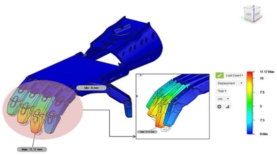 Relative surface displacement in response to loads showed a maximum observed value of 11.17 mm in the proximal region of the middle finger phalanges, as shown in Figure 21. This is because the middle finger is farthest from the fulcrum point, or that is, the torque in this finger is higher than in the other fingers. The generated color map shows that the tensions in the index finger (region in blue tint) indicate that the tensile forces in this finger were not as significant as in the other fingers.
