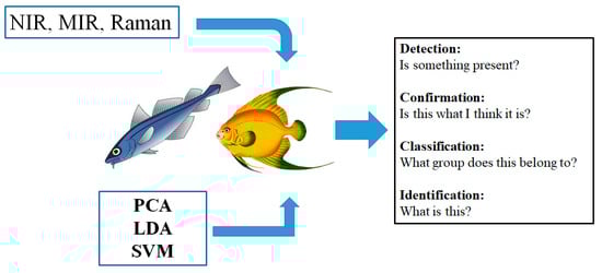 Regardless of the method or technique used (chemometric and spectroscopy) during the process of developing the application, important questions must be addressed depending on the objective or target. For example, if the application targets only what is present in the sample (e.g., is something present in the sample?) the objective of the application will be focused on detection; if the application aims to confirm what is in the samples (e.g., is this what we think it is?); the application will focus on classification, if the application questions the environment of the target molecule/atom (e.g., what group does this belong to?) the application targets what is present in the sample and will focus on identification (e.g., what is this?) (see Figure 2).
