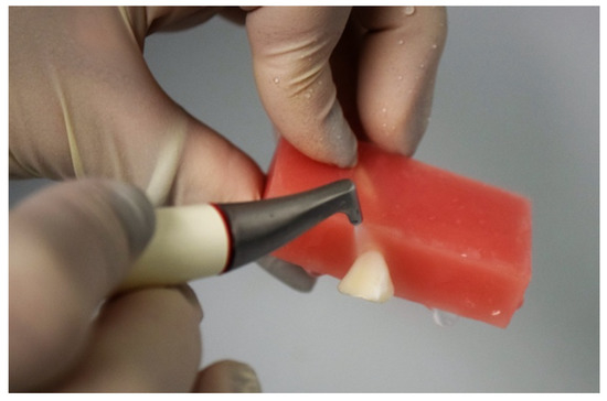 Sixty extracted bovine mandibular incisives were stored in physiological saline solution at a temperature between 5 °C and 10 °C [23]. They were embedded in autopolymerizable methacrylate resin block of dimensions 35 × 50 × 14 mm (ProBase Cold, Ivoclar Vivadent, Bologna, Italy), with the cement–enamel junction above 1 mm and orthogonal the resin base. After horizontal preparation of 1–1.5 mm using a diamond chamfer bur on lingual surface near the cementum–enamel junction of each tooth, air-polishing was performed (S2, EMS) with sodium bicarbonate-based powders (EMS) on 60 teeth for 30 s at distance of about 3 centimeters on total surface of each tooth (Figure 1).