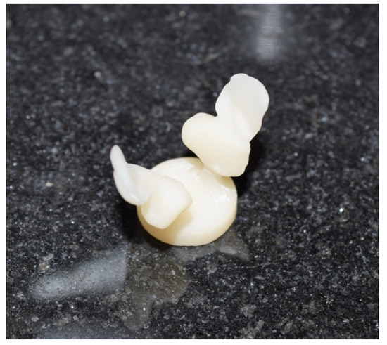 The RBFDP presented the same parameter setting, shape, and size of the cantilever tooth, independently from the anatomical morphology of the bovine mandibular incisives. The retainer wings were fabricated with a uniform thickness of 0.7 mm. The connectors were designed with a height of 3 mm and a width of 1.5 mm [24,25]. Twenty RBFDPs with a cantilevered single-retainer design for the groups were fabricated with 3 different materials: zirconia (Katana ML, Kuraray, Milano, Italy), lithium disilicate (IPS e.max Press LT A2, Ivoclar Vivadent, Bologna, Italy), and PMMA-based material with ceramic fillers (HIPC, Bredent GmbH, Senden Germany). Each RBFDP has been created by the same CAD design with different procedures based on the type of material. The twenty RBFDPs in HIPC were milled by a computer numerical control machine (Roland DWX-50, Roland DG Corporation, Osaka, Japan). The excessive material was removed with tungsten bur (Komet Dental; H250NEX). All of the samples were polished using a polisher machine (Sirio Dental, Meldola (FC), Italy). Twenty zirconia RBFDPs were milled by a CNC machine (Roland DWX-50, Roland DG Corporation, Osaka, Japan), polished using diamond burs, and sintered (Nabertherm LHT 01/17 D, Nabertherm, Lilienthal, Germany) for 12 h at 1450 °C following the manufacturing instructions. The 20 RBFDPs in lithium disilicate were fabricated with wax lost technique. A wax block (CeraWax, Co.N.Ce.P.T, Busseto (PR), Italy) was used to mill the RBFDPs. A sprue was waxed onto the cantilever tooth of all RBFDPs. They were then embedded in a universal investment material (IPS PressVest Premium investment, Ivoclar Vivadent, Bologna, Italy), with 2 RBFDPs (Figure 3).
