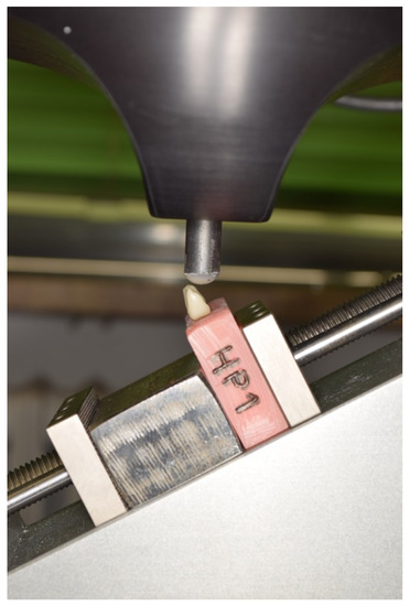 The sprue was removed using a metallic disk and all RBFDPs in lithium disilicate were polish with diamond burs. We obtained 60 comparable RBFDPs with a cantilever design without preparation of the abutment in three different materials. The thickness of the wings of all RBFDPs were measured using a caliper. All of the abutment teeth were treated with the same procedure: 15 s of etching (Scotchbond Universal Etching, 3M, Milano, Italy), 15 s of rinsing with water, 15 s of drying, and the bonding (Scotchbond Universal Adhesive, 3M, Milano, Italy) were applied for 20 s and polymerized for 60 s using a lamp (Valo, Ultradent, South Jordan, UT, USA). All of the RBFDPs were cemented with dual-cured resin cement (Relyx Ultimate, 3M, Milano, Italy) and polymerized for 60 s using led lamp (400–500 nm), but with different procedures. Air abrasion was performed with 50 μm Al2O3 particles at a 2.5 bar pressure for 15 s at a distance of 10 mm on the wings of RBFDPs in zirconia. After drying, the wings were cleaned with 96% isopropanol for 3 minutes. The bonding (Scotchbond Universal Adhesive, 3M, Milano italy) was applied on the wings for 20 s and polymerized for 60 s. Air abrasion was performed with 110 μm Al2O3 particles at a 2.5 bar pressure for 15 s, at a distance of 10 mm on the wings of RBFDPs in PMMA-based material with ceramic fillers. After drying, the primer (Visiolink, Bredent, Seden, Germany) was applied on the wings and polymerized for 60 s. Instead, the wings of RBFDPs in lithium disilicate were etching with hydrofluoric acid (Ceramic Etching gel, Ivoclar Vivadent, Bologna Italy) for 60 s, 60 s of rinsing, and 30 s of drying. The bonding (Scotchbond Universal Adhesive, 3M, Milano, Italy) was applied for 20 s and polymerized for 60 s. All procedures were performed according to the manufacturer’s instructions. The samples were numbered through the engraving on the resin of a code indicating the material. All samples were mounted on a 30° angled support of a universal testing machine (Acumen 3, MTS Systems Corporation, Eden Praire, MN, USA) and a static loading at a crosshead speed of 1.5 mm/min, until failure to the incisal edge of the pontic tooth was performed to simulate real situation (Figure 5). The load was transferred through a 6-mm diameter steatite ball in the middle of the incisal edge of the pontic tooth until failure [25].