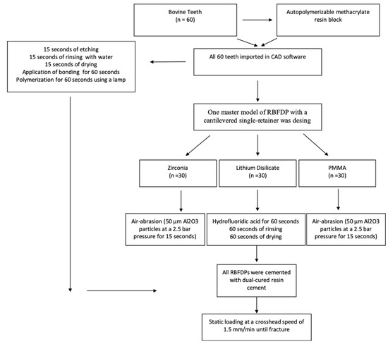 Four types of failure were recorded: debonding of RBFDPs, fracture of the connector, debonding of the RBFDPs with fracture of the abutment tooth, and fracture of the abutment tooth with the RBFDP still bonded. All of the methods were synthetized in the following flowchart (Figure 6).