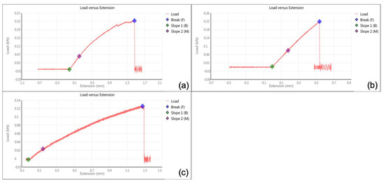 Graphic load-extension of the sample: (a) number 3 in zirconia, (b) number 5 in lithium disilicate, and (c) number 2 in PMMA-based material with ceramic fillers.