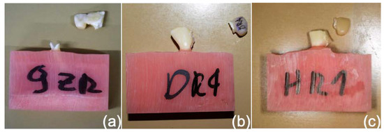 Different types of failure: (a) fracture of the abutment tooth in the group RBFDP in zirconia, (b) fracture of the connector in the group RBFDP in lithium disilicate, and (c) fracture of the connector in the group RBFDP in PMMA-based material with ceramic fillers.