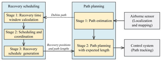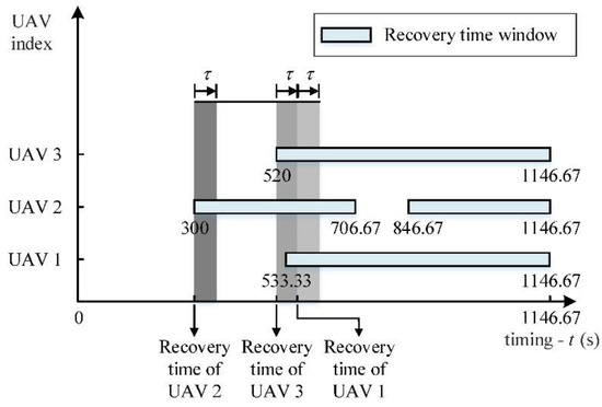 - In stage 2, the recovery sequence is optimized using a GA. Even with relatively few UAVs, finding the optimal recovery sequence is quite complicated. The GA is an efficient heuristic searching algorithm, and it is suitable enough to solve this scheduling problem. The execution process of the GA is given in Section 4.