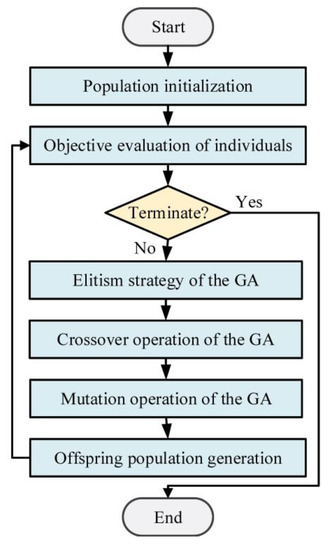 - Initialization. In the GA, the searching space, which is called the population, is the collection of recovery sequences. Utilizing the encoding method, the recovery sequences in the original population are randomly created to guarantee the diversity.