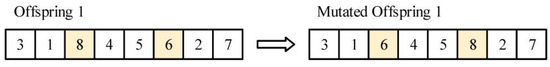 - Crossover. To perform the crossover operation, two recovery sequences are first selected based on the roulette wheel operator. The order crossover operator (OX1) is used to carry out the crossover operation due to its convenience [45] and the two recovery sequences are applied with the crossover operation, with a relatively high probability . Figure 4 shows an example of the crossover operation. During the crossover operation, a sub-sequence is selected from one of the recovery sequences and it is copied to the same location of the offspring. Then, the other recovery serial numbers are filled with the same order as they appear in another recovery sequence starting from the second crossover point. The other offspring is created through the same process.