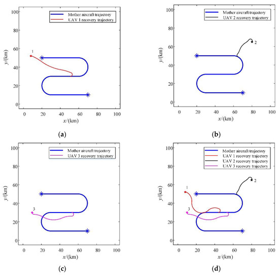 - In stage 3, the recovery schedule for the UAVs is generated based on the optimal recovery sequence, based on a similar iteration to Equation (7). Since the mother aircraft trajectory is predefined, the recovery positions on the mother aircraft trajectory can be obtained based on the recovery schedule. Further, the recovery path lengths for the UAVs are obtained since the velocity of the UAVs is known in advance. These results, at this stage, are directly passed to the path planning layer as the input.