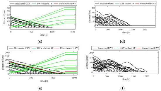 - Objective evaluation. During the aerial recovery process, the UAVs need to keep a safe distance between each other to avoid collisions. The fitness value of each recovery sequence can be obtained from Equation (10) if the corresponding trajectories will not cause collisions. Conversely, the recovery sequences that will cause collisions are penalized with the “death penalty”, i.e., they are given a fitness value of −1. Thus, these invalid recovery sequences are eliminated during the evolutionary process.