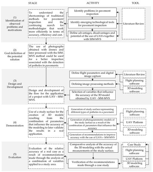 In the first stage, a literature review was carried out to identify emerging technological tools and problems used in pavement inspection and to define the advantages, disadvantages and potential of using a UAV platform in conjunction with the SfM–MVS method. The literature review was carried out through the web databases of Web of Science and Scopus. In the second stage, the research objective was defined. In the third stage, a solution was designed for the application of a project with UAV-SfM–MVS. This project seeks to materialize the previous scenario. This solution is expected to deliver a clear workflow for the acquisition and processing of images obtained through a UAV platform using the SfM–MVS technique. In the fourth stage, a study surface was generated, which represents different sizes of potholes on a pavement. This study surface sought to demonstrate the expected use of the solution created through its 3D modeling by multiple combinations of variables. Finally, the conclusions obtained were translated into practical recommendations for the solution. In the fifth stage, the solution and recommendations obtained in the previous stage were evaluated through a comparison with a real case study. Finally, at this same stage, the fulfilment of the main research objective is questioned, in addition to future work related to the solution.