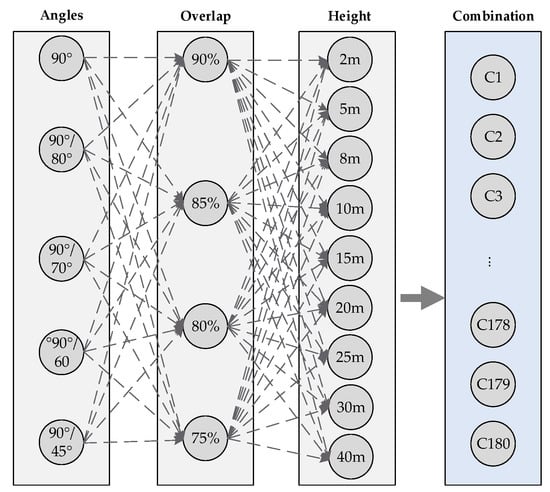 In summary, 180 configurations are shown in Figure 4. These describe the combination of the variables that influence the accuracy of the model obtained by UAV SfM–MVS.